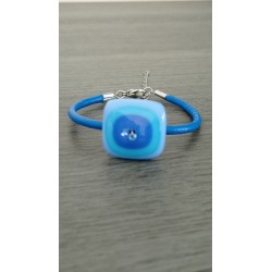 Bracelet composé d'une pièce de verre fusing bleu décoré, monté sur cuir bleu et acier inoxydable.