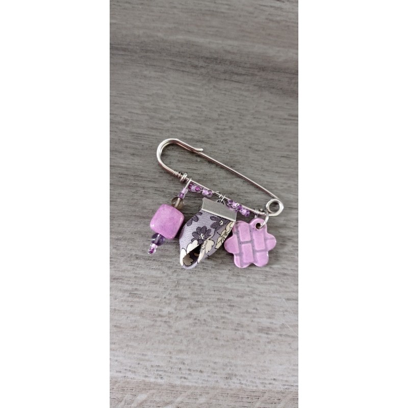 Broche épingle acier inoxydable violette. Alliance de diverses pieces de faïences et ruban.