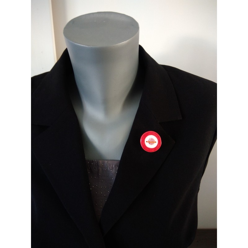 Broche composé d'un bouton de faïence émaillé rouge et blanc, monté sur acier inoxydable.