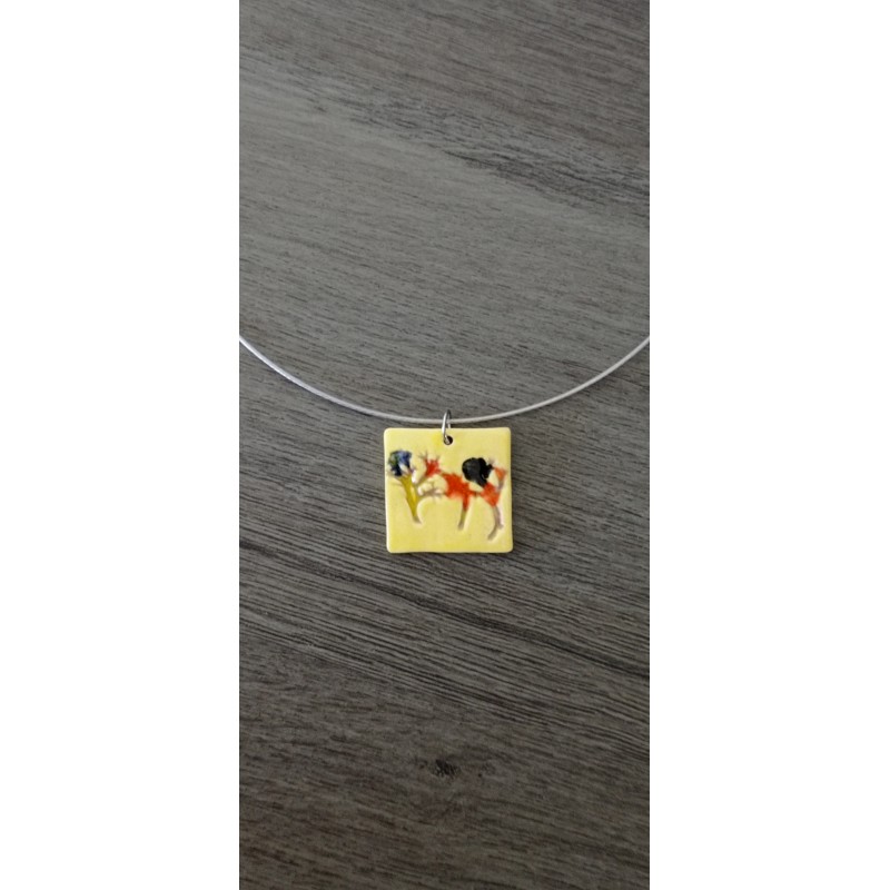 La base du pendentif est en faïence émaillé jaune. Pour réaliser les motifs, j'utilise des végétaux de mon jardin dont j'incruste la forme au moment du midelage.