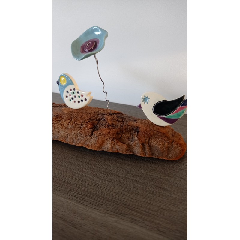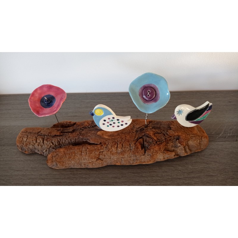 Jolie décoration composé de 2 fleurs et 2 oiseaux colorés, le tout en faïence émaillée. Monté sur un joli morceau de bois flotté.