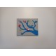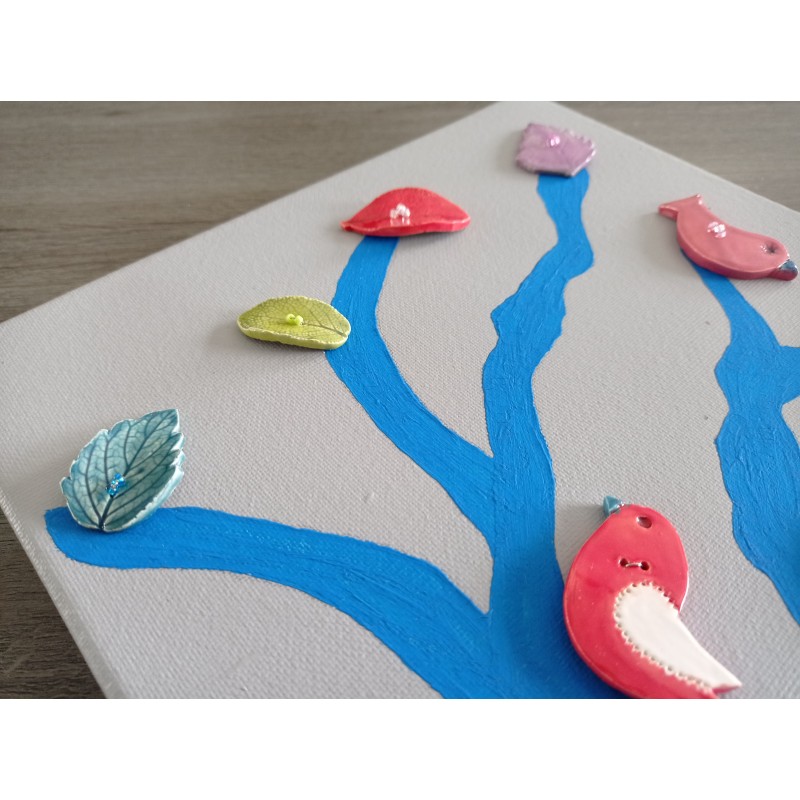 Cadre composé d'une branche bleu craquelé, peinte à l'acrylique. Les oiseaux et les feuilles colorés sont en faïence blanche émaillé, cuites au four à 1000 degrés.