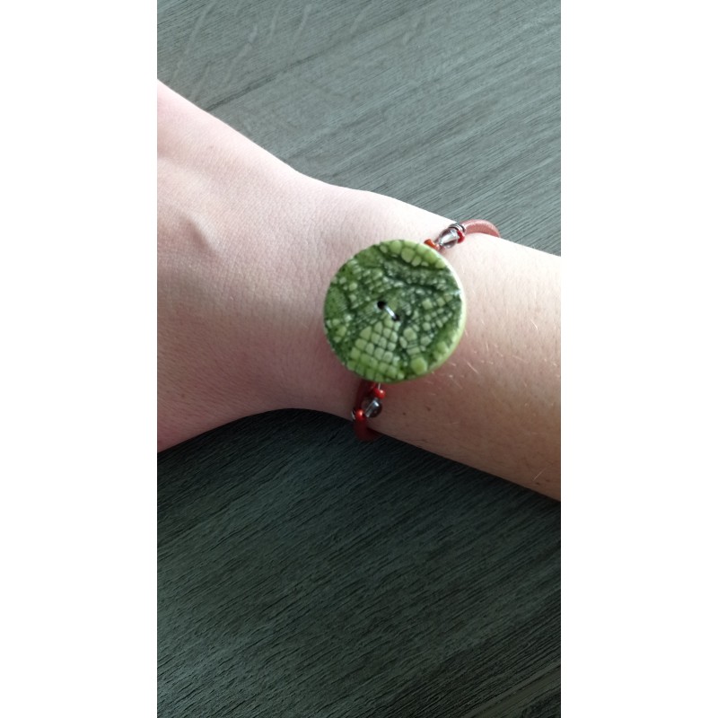 Colori vert et noir pour ce bracelet bouton de céramique. Impression dentelle. Monnté sur un cordon de cuir marron avec fermoir d'acier inoxydable, ce qui évitera les allergies et permettra la durée dans le temps de votre bijou. Taille réglable.