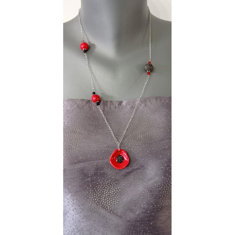 Sautoir coquelicot rouge et noir faïence sur acier inoxydable anallergique