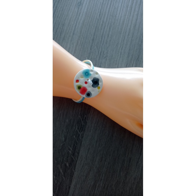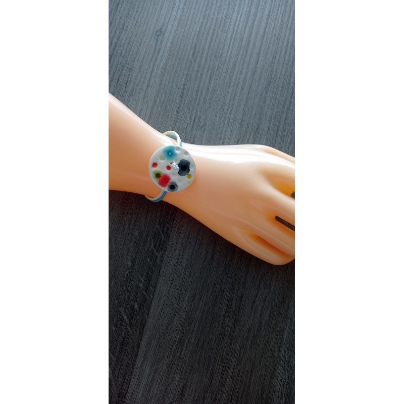Bracelet composé d'une pièce de faïence émaillé avec taches de couleurs, monté sur cuir bleu, blanc et acier inoxydable.