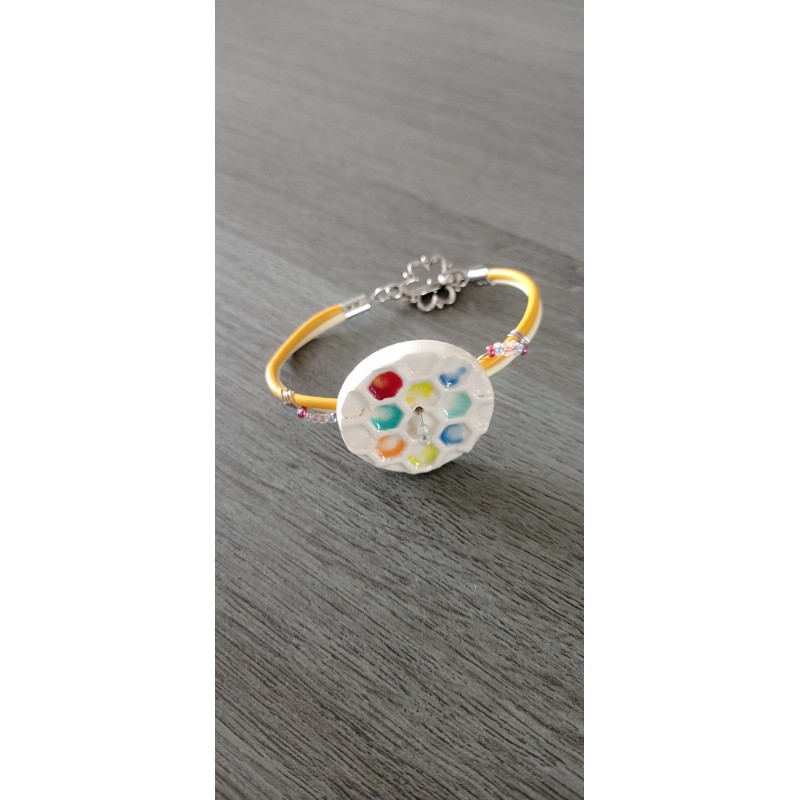 Bracelet multicolore faïence artisanale sur cuir jaune et blanc, acier inoxydable made in france vendée