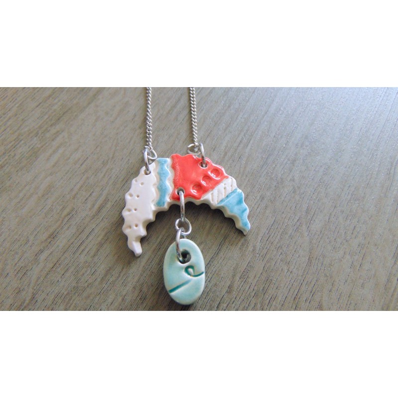 Colori rouge, blanc et vert turquoise pour ce pendentif de céramique monté sur une chaine d'acier inoxydable, ce qui évitera les allergies et permettra la durée dans le temps de votre bijou.