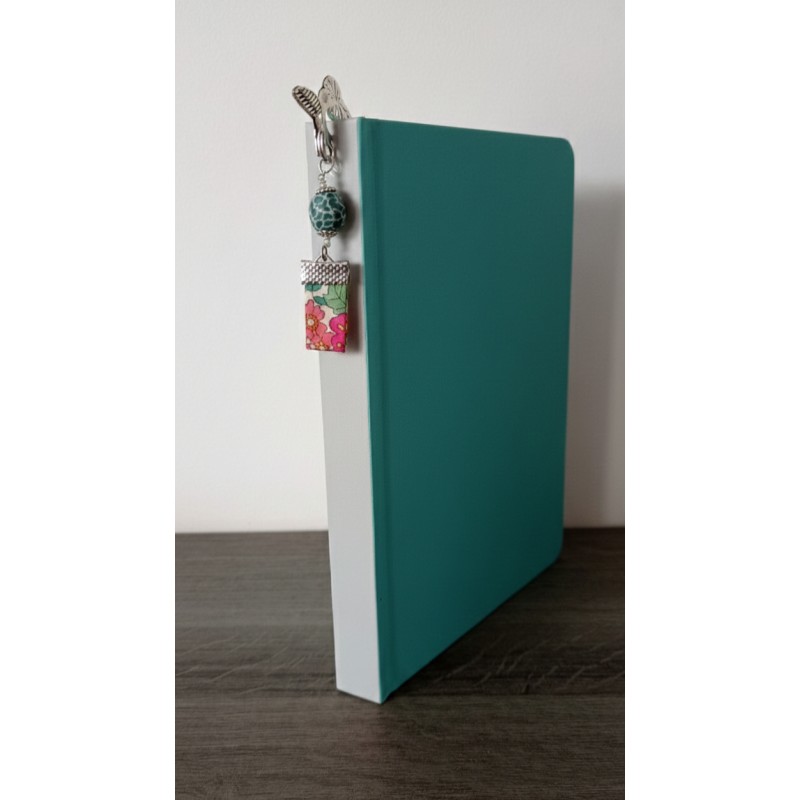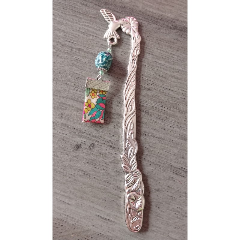 Marque-page turquoise céramique, ruban fleuri et métal argenté