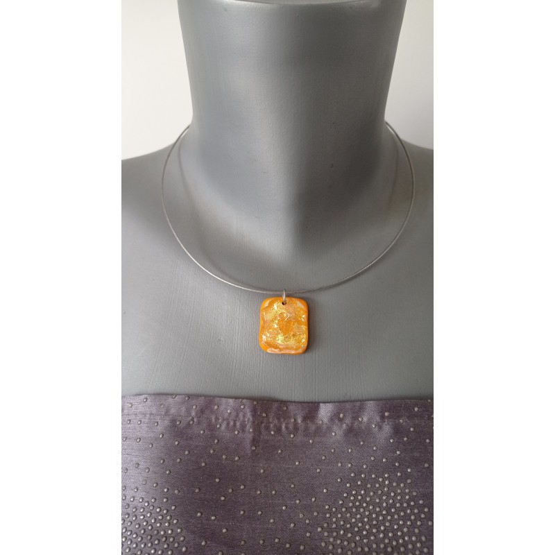 Pendentif orange transparent en verre dichroic à reflet rose doré fusionné au four à 800 degrés et tour de cou acier inoxydable.