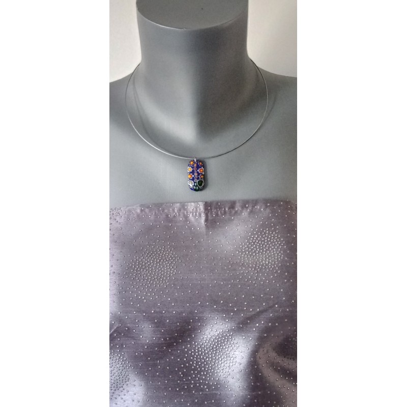 Coloris bleu foncé et rouge à fleurs avec une pointe de jaune. Monté sur un tour de cou d'acier inoxydable.