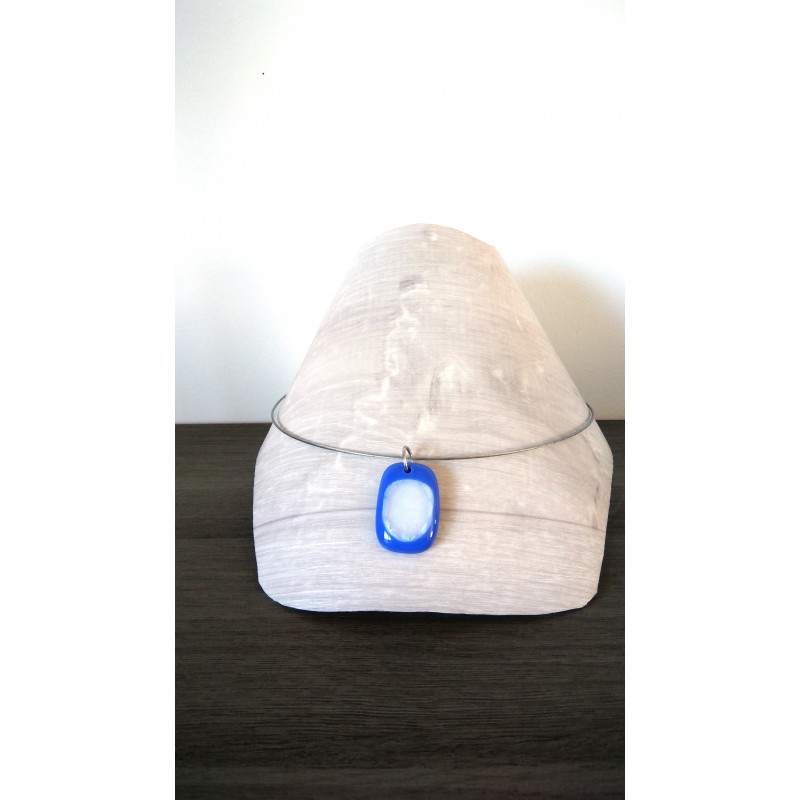 Pendentif bleu en verre dichroic à reflet blanc irise fusionné au four à 800 degrés et chaine d'acier inoxydable.
