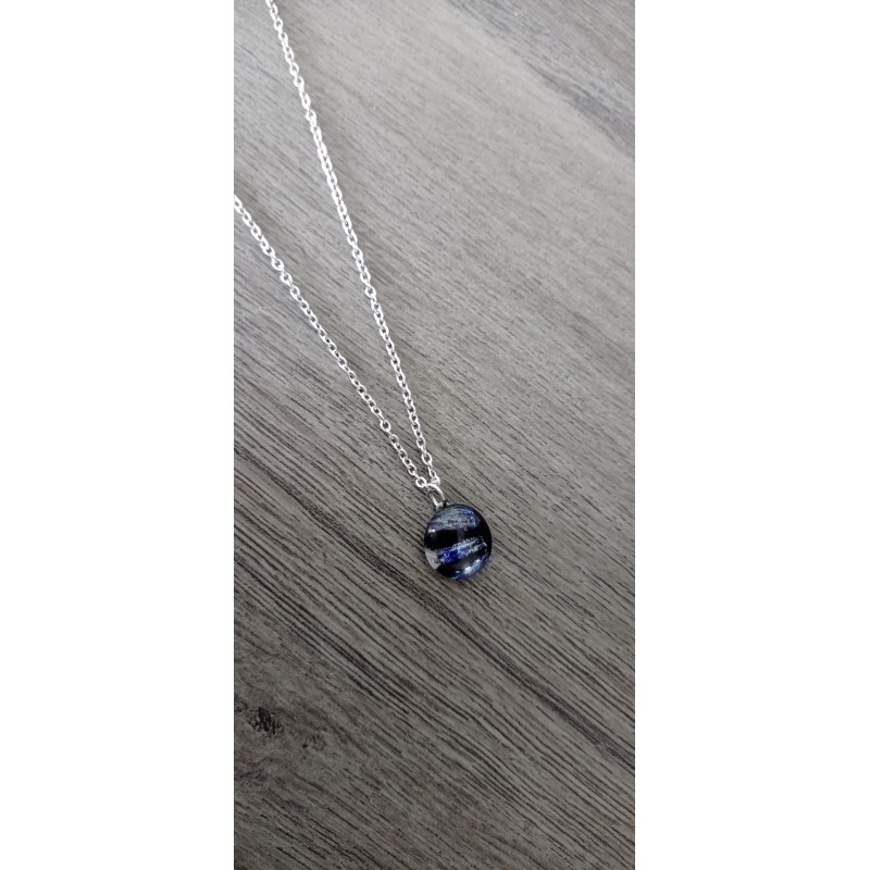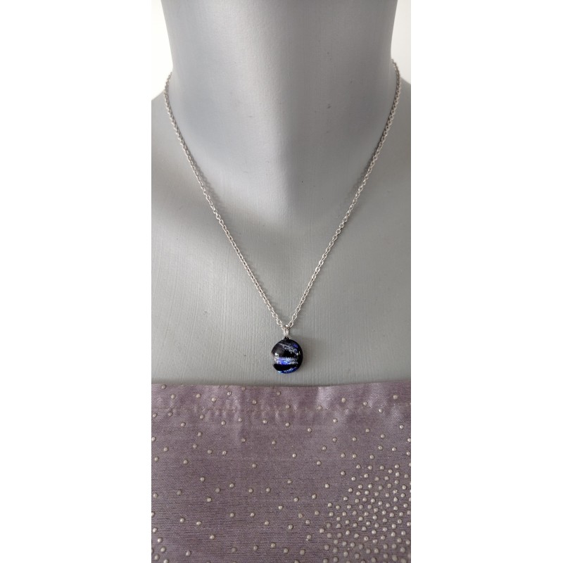 Pendentif noir violet en verre dichroic fusionné au four à 800 degrés et chaine d'acier inoxydable.