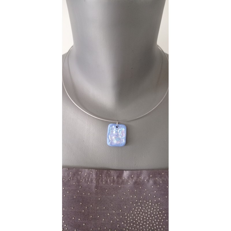 Base bleu clair allié à du verre dichroïc, reflet rosé, doré. Monté sur un tour de cou en acier inoxydable.