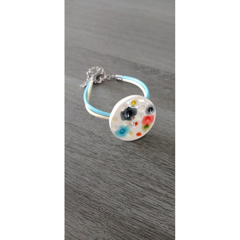 Colorful homemade earthenware bracelet on blue leather and stainless steel made in france vendée
