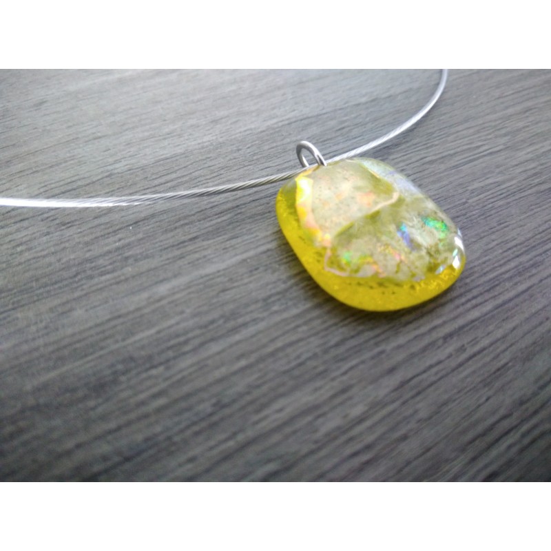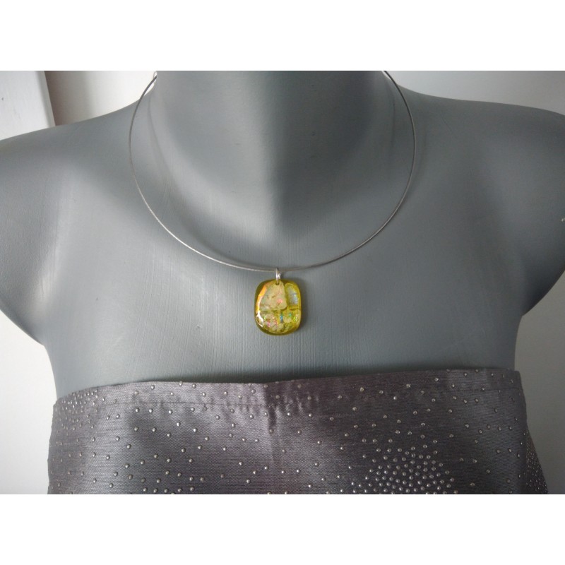 Yellow green base combined with dichroïc glass, iridescent reflection. Mounted on a stainless steel neck circumned.