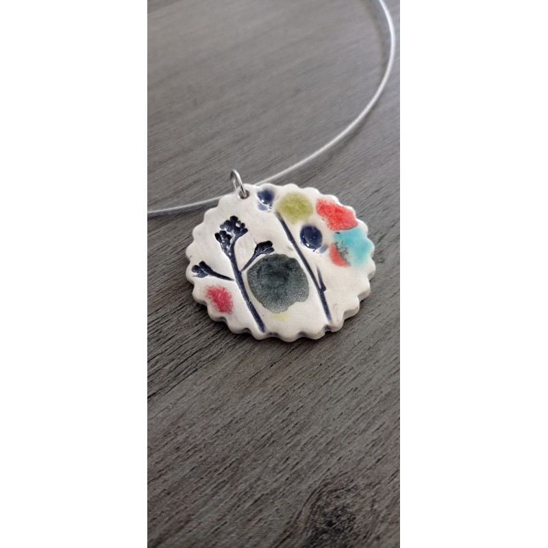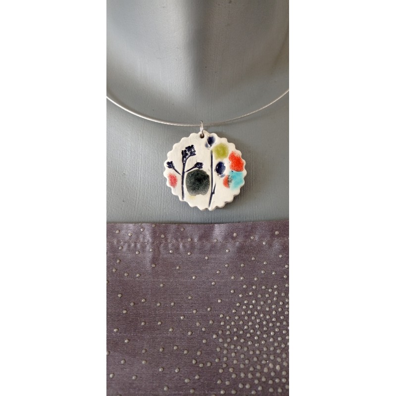 Purple and green enamelled faïence on a cream base. Mounted on a stainless steel neck, which will avoid allergies and allow the duration in time of your jewel.
