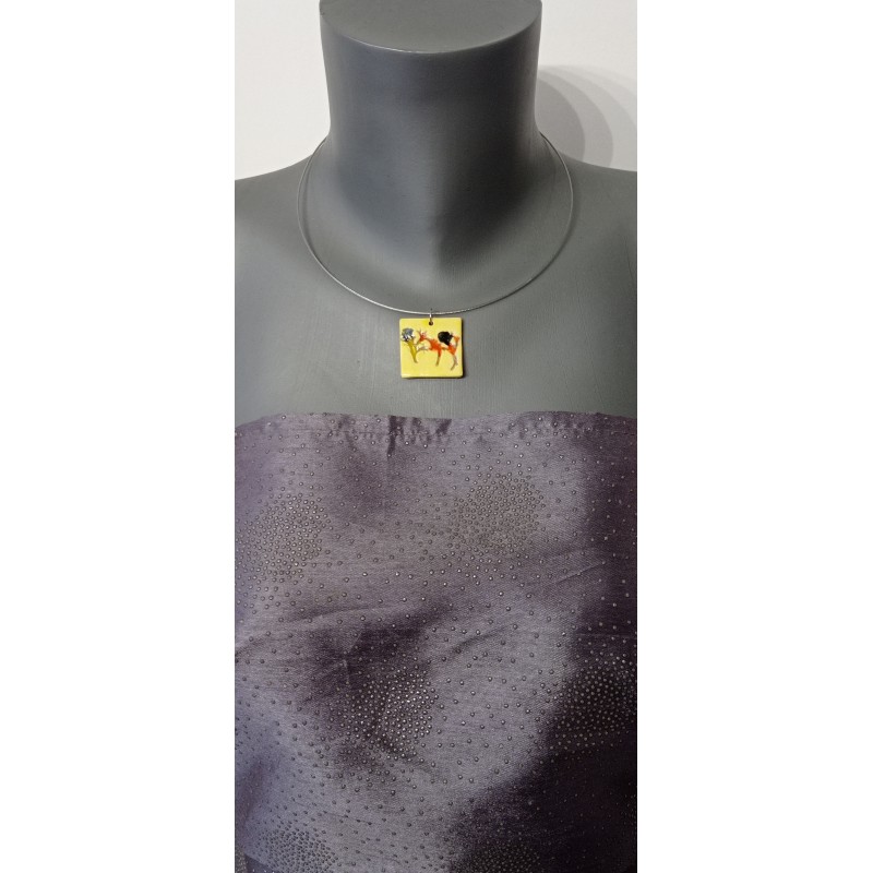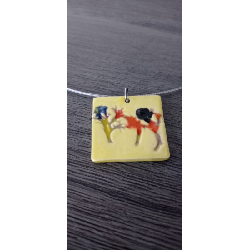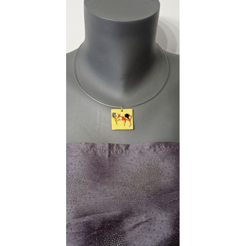 Turquoise and green enamelled faïence on a cream base. Mounted on a stainless steel neck, which will avoid allergies and allow the duration in time of your jewel.