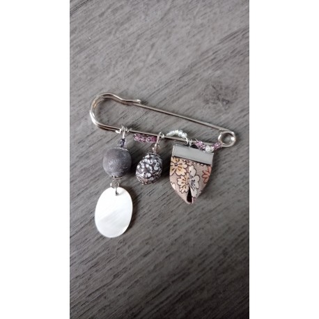 Enamelled brown earthenware pin. This creation is composed of various pieces modeled and enamelled in the workshop. Embellished with vintage white lace for a chic look.