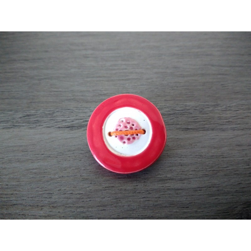 A brooch consisting of a red and white enamelled earthenware button, mounted on stainless steel.
