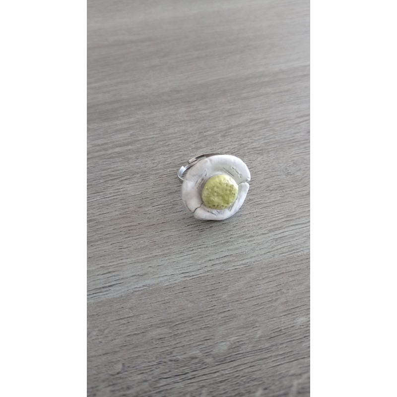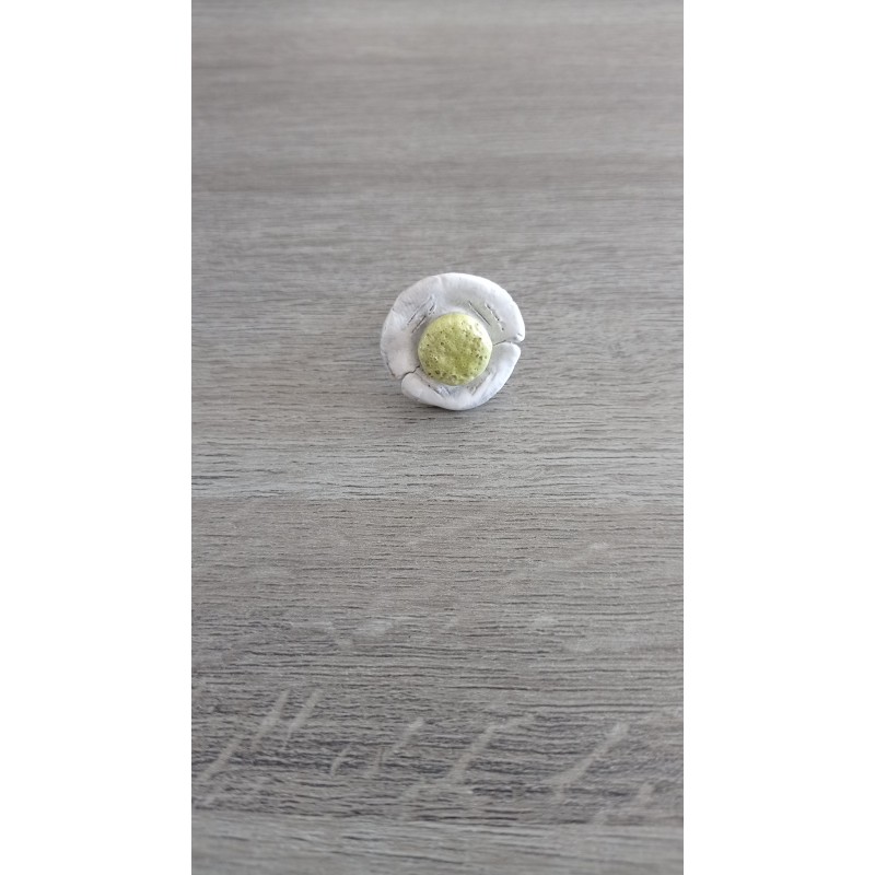 Ceramic flower ring, white earthenware covered with green and white enamel.